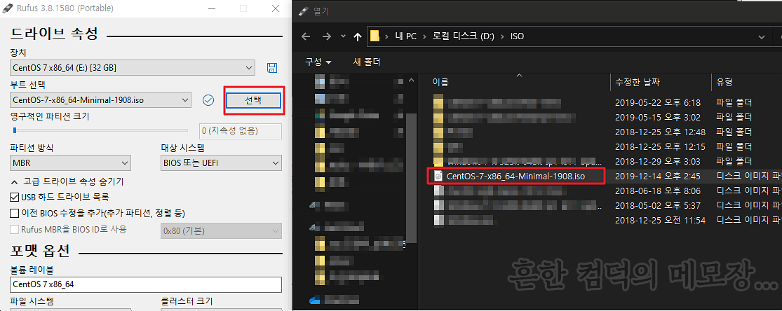 그 후, "선택" 버튼을 눌러 준비한 ISO 파일을 지정해주도록 하자. (필자의 경우 CentOS 이다. 각자 준비한 것을 지정하자)