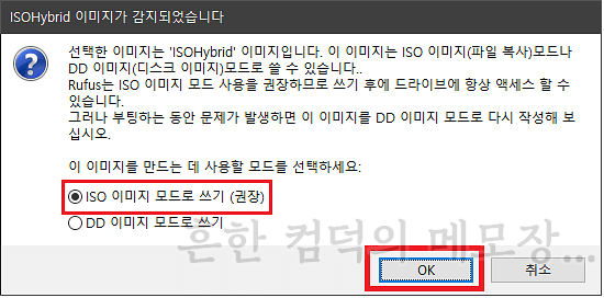 리눅스 설치용 부팅USB 를 만드는 경우 위와 같은 경고창이 출력될 수 있다. 이 경우 "ISO 이미지 모드로 쓰기" 에 체크하면 대부분 문제 없이 잘 진행된다. 만약 부팅USB 제작 후 운영체제 설치 과정에서 문제가 발생한다면, "DD 이미지 모드로 쓰기" 를 체크하여 다시 한번 부팅USB 를 제작, 운영체제 설치를 다시 한번 시도해보시기 바란다.