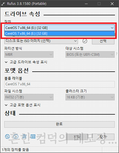 준비한 USB 를 컴퓨터에 연결하고 Rufus 를 실행시키고, 부팅USB 로 만들고자 하는 USB 를 지정해 준다. 최상단의 "장치" 탭에서 USB 를 지정해주면 된다. 컴퓨터에 USB 가 여러 개 연결되어 있는 경우, 부팅USB 로 만들고자 하는 USB 만 연결하고, 나머지는 모두 연결을 해제한 후 작업을 진행하는 것을 권장한다. (까딱 잘못하면 다른 USB 의 데이터가 초기화될 수도 있기 때문이다.)