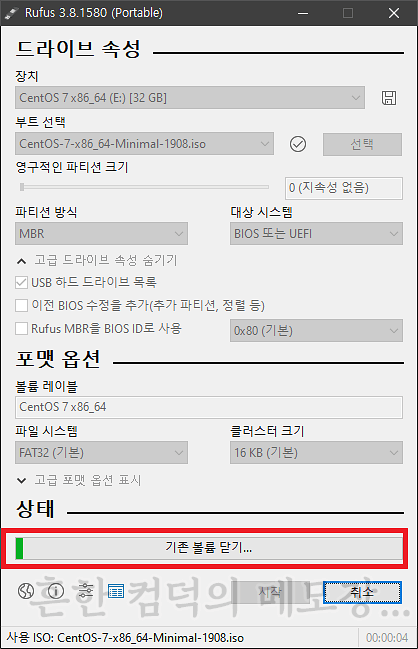 확인 버튼을 눌러주면, Rufus 가 자동으로 부팅USB 를 만들어 준다. ISO 파일의 용량, USB 등 다양한 요인에 따라 소요 시간은 천차만별이니, 느긋하게 기다려 주자.