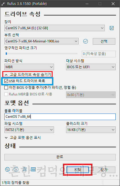 만약, USB 지정 시 원하는 USB가 목록에 출력되지 않는 경우, "고급 드라이브 옵션 숨기기" → "USB 하드 드라이브 목록"을 체크한 뒤 다시 확인해 보자. ISO 파일을 올바르게 지정하였다면 "시작" 버튼을 눌러 부팅USB 를 만들어 주자. 파일 시스템 등은 Rufus 에서 자동으로 맞추어 주기 때문에 신경쓰지 않아도 된다.
