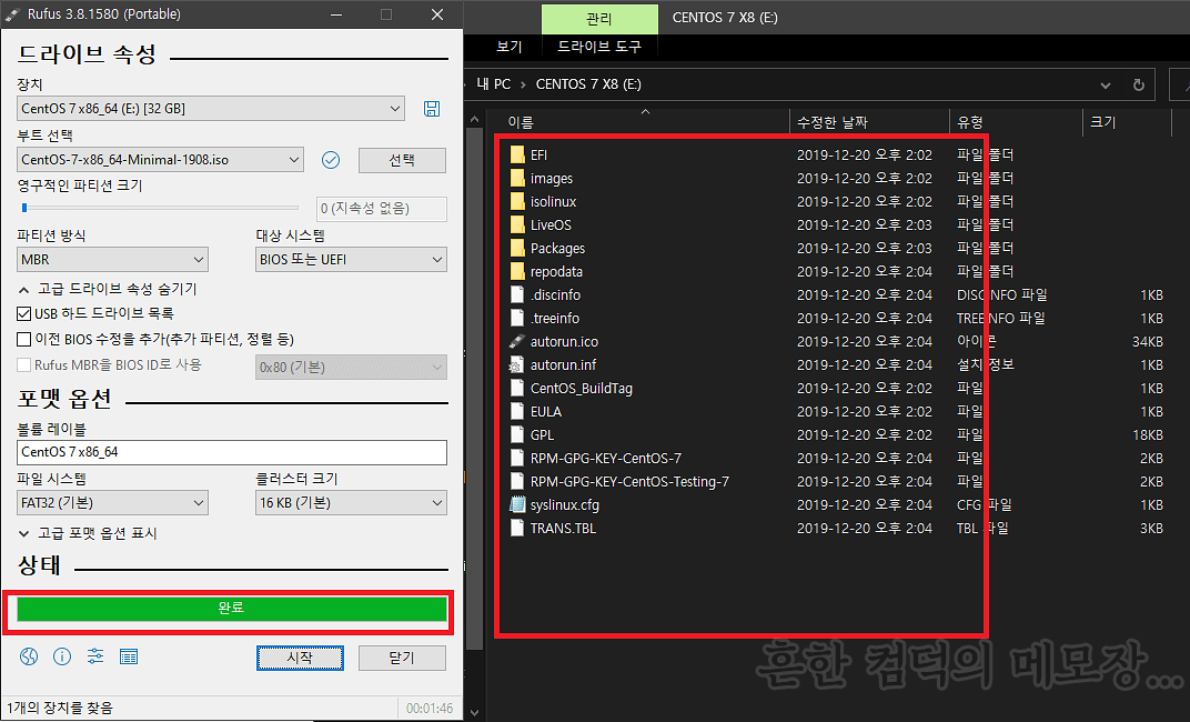 부팅USB 제작이 완료되면, 상태 바가 꽉 차면서 "완료" 라는 멘트가 출력된다. 파일 탐색기에서 USB 를 열어보면, USB 부팅 및 운영체제 설치에 필요한 파일들이 잘 들어가있음을 확인할 수 있다.