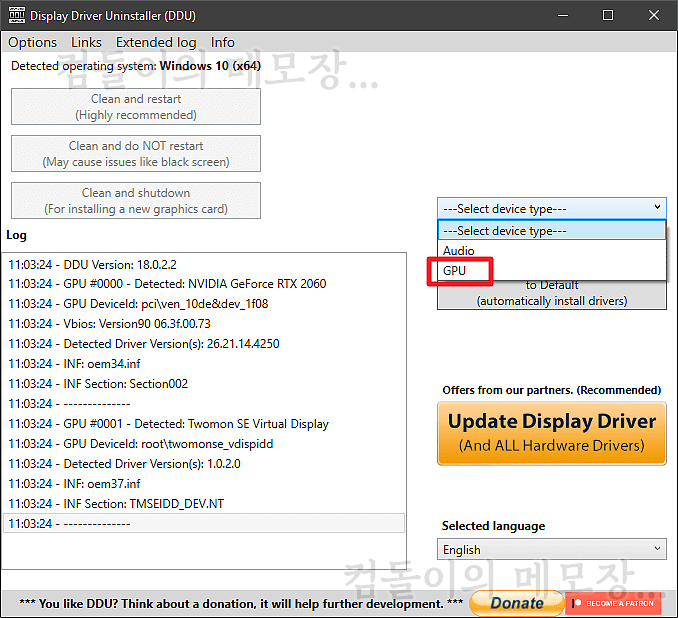 DDU가 실행되면, 좌측의 "Select Device Type" 을 누른 뒤 "GPU" 를 선택해 주자. 그럼 자동으로 설치된 드라이버를 감지한다.